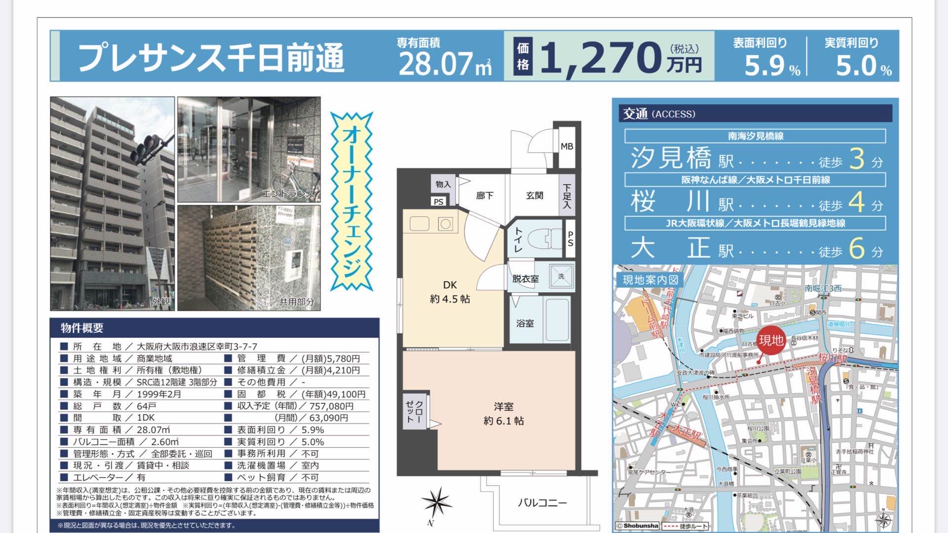 1999年建,位于大阪市浪速区,交通便利,距离汐见桥步行圈以内的收益率高的公寓。管理费和房屋维修费都比较低,将来自己居住也很划算。公寓楼体耐震结构,有快递置物箱,住户24小时可以扔垃圾,有自行车停车场,电梯设置,汽车停车场,自动门锁和监控。室内可以养宠物,配有暖气房,24小时新风系统,电视监控,24小时应急系统,开放式厨房,浴室干燥机、光纤网络。