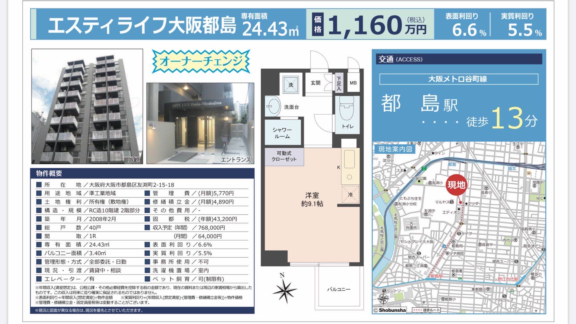 2008年2月建,位于大阪市都島区友渕町,交通便利,距离都岛站步行圈以内的收益率高的公寓。管理费和房屋维修费都比较低,将来自己居住也很划算。公寓楼体耐震结构,有快递置物箱,住户24小时可以扔垃圾,有自行车停车场,电梯设置,汽车停车场